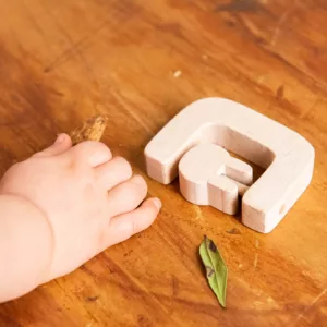 Chaque pièce est soigneusement coupée, poncée et assemblée à la main, sans vernis ni traitement chimique, permettant au bois de développer une patine naturelle avec le temps. Cette approche artisanale garantit des jouets uniques, conçus pour traverser les générations.